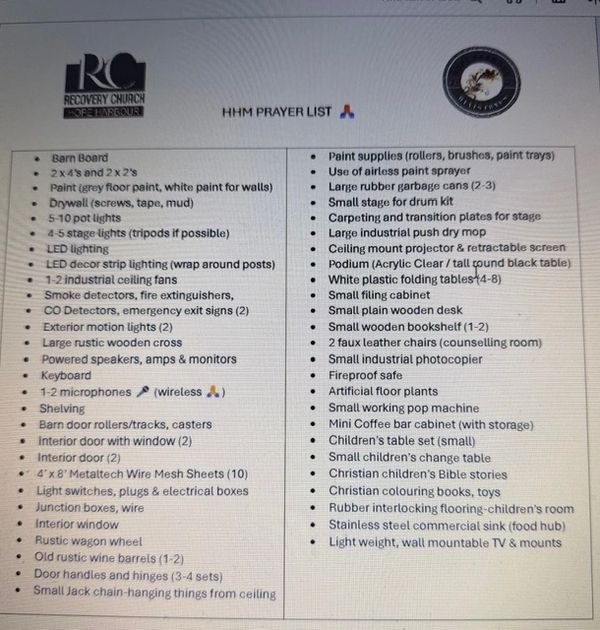HHM is in need of community support for the above 'Prayer List' items...if you or someone you know has any of the above needed items please reach out to Pastor Dale
